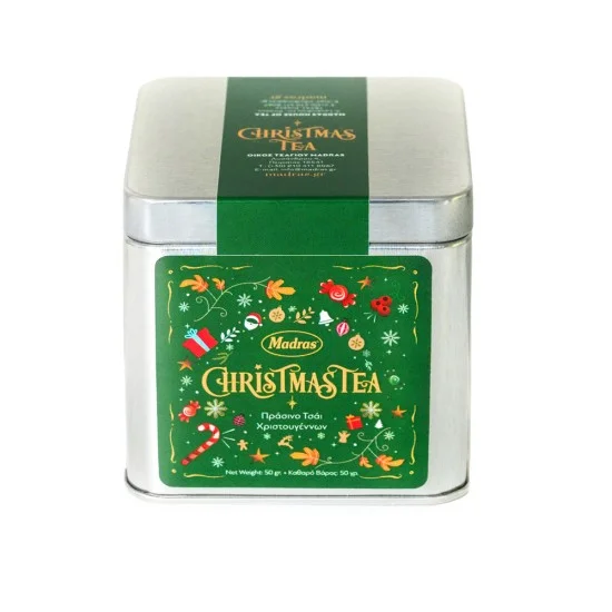 Το απόλυτο γιορτινό τσάι Christmas Tea σε μεταλλικό κουτάκι 50g. Ένα premium μείγμα από πράσινο τσάι, αρωματικό πορτοκάλι, κανέλα, γαρίφαλλο, σταφίδες και αμύγδαλο, που δημιουργούν έναν ζεστό, γλυκό και πλούσιο συνδυασμό, ιδανικό για τις χειμερινές μέρες.